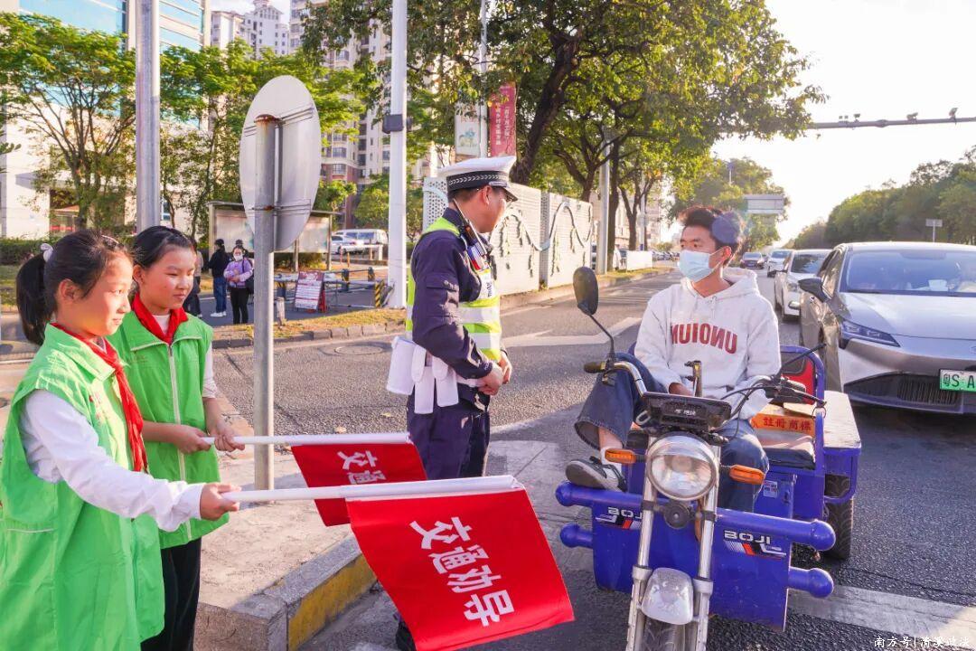 最后,在交警的带领下,亲子志愿者分组前往附近主要路口,开展文明交通劝导志愿服务。大家化身 “文明交通使者”,手执劝导旗,对行人闯红灯、非机动车逆行等不文明交通行为进行温柔劝导,引导市民遵守交通规则、安全有序出行。